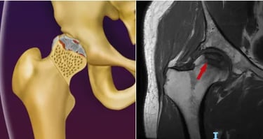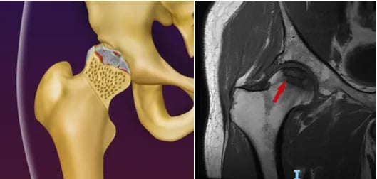A Osteonecrose da cabeça do fêmur ocorre devido a um defeito na circulação sanguínea para a cabeça do fêmur, levando à morte do osso nessa região, fazendo com que o paciente tenha dor no quadril, muitas vezes acompanhada de dor na coxa.