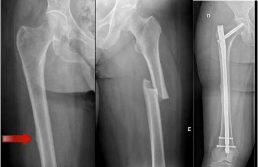 Antes de a fratura propriamente dita ocorrer, o paciente apresenta uma dor na coxa por algumas semanas, causada por uma microfratura no osso, algumas vezes referida como dor no fêmur.
