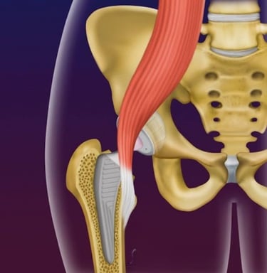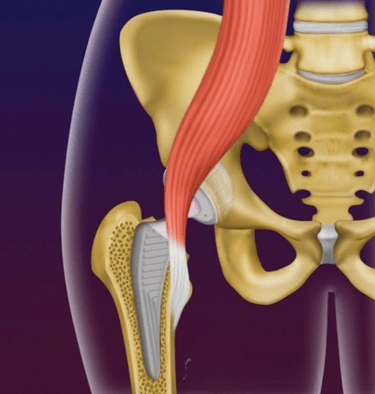 Imagem ilustrando o tendão do iliopsoas passando próximo à prótese de quadril, podendo causar tendinite do iliopsoas.